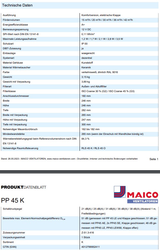 Maico PP 45 RC Endmontage-Set – Effiziente Lüftung mit FunksteuerungErleben Sie optimales Raumklima mit dem Maico PP 45 RC Endmontage-Set – für gesünderes Wohnen und höchste Energieeffizienz.Das Maico PP 45 RC Endmontage-Set ist die ideale Lösung für ein dezentrales Lüftungssystem in Ihrem Zuhause. Es bekämpft effektiv Feuchtigkeit, unangenehme Gerüche und Schimmelpilze, um ein dauerhaft frisches und gesundes Raumklima zu gewährleisten. Als Teil der leisesten Gerätereihe auf dem Markt und mit einer Energieeffizienzklasse von A+ setzt dieses Gerät neue Maßstäbe in Sachen Komfort und Wirtschaftlichkeit.Ihre Vorteile im Überblick:Qualität Made in Germany: Verlassen Sie sich auf höchste Standards und Langlebigkeit.Hervorragende Energieeffizienz: Mit Energieeffizienzklasse A+ und einem SPI-Wert von nur 0,12 Wh/m3 sparen Sie Heizkosten und schonen die Umwelt.Extrem leiser Betrieb: Mit Schalldruckpegeln ab 21 dB(A) sorgt das Gerät für ungestörte Ruhe in Ihren Räumen.Automatischer Schutz: Die elektrische Klappe schließt bei Abschaltung vollständig und energieautark.Einfache Wartung: Werkzeugloser Ausbau des Rohreinschubs und der Filter für schnelle und unkomplizierte Reinigung.Flexibilität durch Funksteuerung: Komfortable Bedienung und zentrale Steuerung des Lüftungssystems.Verbessertes Raumklima: Effektive Reduzierung von Feuchtigkeit, Gerüchen und Schimmelpilzen.Vielseitige Lüftungsstufen und BetriebsprogrammeDas Maico PP 45 RC bietet Ihnen die volle Kontrolle über Ihr Raumklima mit 5 wählbaren Lüftungsstufen (15/20/30/36/42 m3/h) und 3 intelligenten Betriebsprogrammen: Dauerentlüftung mit Wärmerückgewinnung, Querlüftung und sensorgeführter Autobetrieb. Diese Vielfalt ermöglicht eine präzise Anpassung an Ihre individuellen Bedürfnisse und die Umgebungsbedingungen.Passen Sie die Lüftungsintensität an die Raumauslastung an oder lassen Sie das Gerät sensorgesteuert für ein durchweg optimiertes Klima arbeiten. Dies sorgt nicht nur für frische Luft, sondern optimiert auch den Energieverbrauch.Effiziente WärmerückgewinnungDank des integrierten Keramik-Wärmetauschers und eines Wärmebereitstellungsgrades von 84,3 % wird die Wärme der Abluft effektiv zurückgewonnen und der frischen Zuluft zugeführt. Dies minimiert Wärmeverluste und senkt Ihre Heizkosten spürbar, ohne dabei auf frische Luft verzichten zu müssen.Die hohe Wärmerückgewinnungsrate macht das PP 45 RC zu einer nachhaltigen Lösung, die aktiv zum Energiesparen in Ihrem Haushalt beiträgt und gleichzeitig für Komfort sorgt.Komfortable Funksteuerung und automatische KlappeAls Funkversion verfügt das PP 45 RC über eine elektrische Klappe und Funksteuerung für höchste Benutzerfreundlichkeit. Die Klappe schließt automatisch, wenn das Gerät ausgeschaltet ist, und verhindert so den Eintritt von Außenluft, ohne dabei elektrische Energie zu verbrauchen.Die integrierte Funksteuerung ermöglicht eine bequeme Bedienung und die Einbindung in ein zentral gesteuertes Lüftungssystem, wie zum Beispiel mit der Raumluftsteuerung RLS 45 K.Technische SpezifikationenParameterWertBesonderheitArtikelPP 45 RCFunkversion, elektrische KlappeFördervolumen15 / 20 / 30 / 36 / 42 m3/h5 wählbare StufenEnergieeffizienzklasseA+Sehr hohe EnergieeffizienzBemessungsspannung230 VStandardanschlussSPI-Wert nach DIN EN 13141-80,12 Wh/m3Exzellenter spezifischer LeistungseingangMaximale Leistungsaufnahme1,2 W / 1,7 W / 2,1 W / 2,8 W / 3,5 WSehr geringer Energieverbrauch je StufeSchutzartIP 00Sicherheit in BadbereichenDIBT-ZulassungJa (Z-51.3-416)Baurechtlich zugelassenEinbaulageWaagerechtFlexible InstallationSystemartDezentralEinzelraumlüftungMaterial GehäuseKunststoffRobust und langlebigMaterial WärmetauscherKeramikEffiziente WärmespeicherungFarbeVerkehrsweiß, ähnlich RAL 9016Neutrales, anpassungsfähiges DesignGewicht3,178 kgLeicht und handlichWärmebereitstellungsgrad nach DIN EN 13141-884,3 %Hohe WärmerückgewinnungNotwendige RaumluftsteuerungDS 45 RC oder RLS 45 K mit PP 45 EOFür vollen FunktionsumfangSchallparameterWertHinweisSchalldruckpegel (1 m Abstand)21 dB(A) / 25 dB(A) / 31 dB(A) / 35 dB(A) / 38 dB(A)Je Lüftungsstufe, FreifeldbedingungenBewertete max. Element-Normschallpegeldifferenz Dn,w51 dBGemessen mit PP 45 LE und Klappe geschlossenAbmessungMaßHinweisAnschlussdurchmesser160 mmStandardBreite246 mmKompakte BauweiseHöhe246 mmKompakte BauweiseTiefe282 mmGesamttiefe des GerätsNotwendiger Mauerdurchbruch162 bis 182 mmFür optimale InstallationWandstärke (Einschub bündig)265 mm (Minimum)Minimal erforderliche WandstärkeMaximale Wandstärke500 mmMaximale Wandstärke für InstallationFilterdetailsTyp / KlasseBeschreibungFilterartAußen- und AbluftfilterLuftfiltration in beide RichtungenFilterklasseISO Coarse 30 % (G2) / ISO Coarse 45 % (G3)Für effektive Partikelentfernungtody>Einsatzbereiche & AnwendungsszenarienDas Maico PP 45 RC Endmontage-Set ist die perfekte Lösung für eine dezentrale Zu- und Abluftlüftung mit Wärmerückgewinnung in einzelnen Räumen oder als Teil eines umfassenden Lüftungssystems nach DIN 1946-6. Es ist besonders geeignet, um Feuchtigkeitsprobleme in Bädern, Küchen oder anderen Feuchträumen zu bekämpfen und unangenehme Gerüche sowie Schimmelbildung effektiv zu verhindern.Ideale Anwendung findet das Gerät in Wohnungen, Einfamilienhäusern oder Büros, wo eine energieeffiziente und leise Dauerlüftung gewünscht ist. Durch die Möglichkeit, mehrere Geräte zu koppeln, kann ein optimales Raumklima im gesamten Gebäude geschaffen werden, wodurch es sich hervorragend für Neubau- und Sanierungsprojekte eignet.Hersteller & QualitätDas Maico PP 45 RC Endmontage-Set stammt von Maico Ventilatoren, einem renommierten Hersteller, der für „Qualität Made in Germany“ steht. Die Produkte erfüllen höchste Qualitätsstandards und sind DIBT-zugelassen (Z-51.3-416), was ihre Konformität mit baurechtlichen Anforderungen und technischen Standards bestätigt.Investieren Sie
