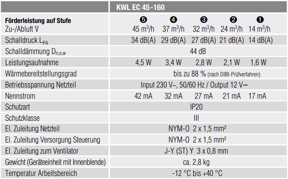 Helios KWL EC 45-160 Geräteeinheit - Effiziente dezentrale Lüftung mit WärmerückgewinnungOptimale Raumluftqualität und Energieeffizienz mit der Helios KWL EC 45-160 Geräteeinheit – für ein behagliches und gesundes Zuhause.Die Helios KWL EC 45-160 Geräteeinheit ist ein hochmodernes, dezentrales Lüftungssystem mit effektiver Wärme- und Feuchterückgewinnung. Speziell für den Einbau in Außenwände in Neubauten und bei Sanierungen konzipiert, sorgt dieses System für eine kontinuierliche Frischluftzufuhr. Gleichzeitig wird bis zu 88% der Wärme aus der Abluft zurückgewonnen, was den Heizbedarf deutlich senkt und das Raumklima optimiert. Das System ist mit einem keramischen Wärmespeicher und einem robusten EPP-Gehäuse ausgestattet, um maximale Effizienz und Langlebigkeit zu gewährleisten.Ihre Vorteile im Überblick:Hohe Energieeffizienz: Erreicht einen Wärmebereitstellungsgrad von bis zu 88% und reduziert spürbar Ihre Heizkosten.Vielseitige Betriebsarten: Bietet flexible Modi wie Wärmerückgewinnung (WRG), Querlüftung, Abluft- und Zuluftbetrieb für jedes Lüftungsbedürfnis.Komplettlösung: Wird mit einer verschließbaren Kunststoff-Innenblende und einem integrierten Filter (ISO Coarse 50%) geliefert.Flüsterleiser Betrieb: Mit einem Schalldruckpegel von nur 14 dB(A) auf niedrigster Stufe sorgt es für ungestörte Ruhe.Robuste Konstruktion: Das Gehäuse aus expandiertem Polypropylen (EPP) garantiert hervorragende Isolierung und Langlebigkeit.Einfache Installation: Ideal für Wandstärken ab 300 mm und dank Auszugshilfe leicht zu warten.Hocheffiziente WärmerückgewinnungDie KWL EC 45-160 Geräteeinheit nutzt einen innovativen keramischen Wärmespeicher, um die Wärmeenergie der Abluft auf die Zuluft zu übertragen. Dies ermöglicht einen Wärmebereitstellungsgrad von bis zu 88%, wodurch wertvolle Heizenergie erhalten bleibt und Ihr Energieverbrauch signifikant reduziert wird.Das System sorgt für eine kontinuierliche Versorgung mit frischer, vorgewärmter Luft, ohne dass Fenster geöffnet werden müssen.Flexible Luftführung und BetriebsmodiAusgestattet mit einem modernen EC-Axialventilator, bietet das System verschiedene Betriebsarten: von der effizienten Wärmerückgewinnung über die Querlüftung bis hin zum reinen Abluft- oder Zuluft-Modus.Dies ermöglicht eine bedarfsgerechte Anpassung an die jeweiligen Raumanforderungen und Wetterbedingungen, stets mit optimierter Luftleistung für ein angenehmes Raumklima.Intelligentes Design und SchutzmerkmaleDie Geräteeinheit ist mit einem Strömungsgleichrichter für eine optimierte Luftführung, einem Insektenschutzgitter gegen unerwünschte Eindringlinge und einer praktischen Auszugshilfe für einfache Wartungsarbeiten ausgestattet.Die integrierte Innenblende mit Filter sorgt für saubere Zuluft und kann bei Bedarf verschlossen werden, was den Komfort und die Funktionalität des Systems erhöht.Technische SpezifikationenParameterWertWärmebereitstellungsgradbis 88%Luftleistung (Stufen)14 / 24 / 32 / 37 / 45 m³/hSpannungsversorgung12 VLeistungsaufnahme1,6 / 2,1 / 2,8 / 3,4 / 4,5 WSchalldruck LPA dB (A) in 3 m14 / 21 / 27 / 29 / 34 dB (A)Energieeffizienzklasse (1253/2014/EU)ASchutzart (IP)IP20Temperatur Arbeitsbereich-12 °C bis +40 °CAbmessungWertGerätedurchmesser160 mmMaße Innenblende (L x B x T)200 x 200 x 45 mmMinimale Wandstärke300 mmGewicht (Gerät + Innenblende)2,8 kgMaterialBeschreibungWärmespeicherKeramischGehäusematerialExpandiertes Polypropylen (EPP)FiltertypISO Coarse 50%Einsatzbereiche & AnwendungsszenarienDie Helios KWL EC 45-160 Geräteeinheit ist die ideale Lösung für vielfältige Einsatzbereiche, von der Wohnraumlüftung bis hin zu kleineren Gewerbeobjekten. Sie eignet sich hervorragend für den Einsatz in Neubauten, um von Beginn an höchste Energieeffizienz zu gewährleisten.Auch bei Sanierungen bietet sie eine unkomplizierte Möglichkeit, alte Lüftungssysteme zu modernisieren oder fehlende Lüftung nachzurüsten. Das System sorgt nicht nur für eine konstante Zufuhr frischer, gefilterter Luft, sondern trägt auch maßgeblich zur Reduzierung des Heizbedarfs bei, was sie zur perfekten Wahl für energiebewusste Modernisierer macht, die Wert auf Komfort und gesunde Raumluft legen.Hersteller & QualitätDie Helios KWL EC 45-160 Geräteeinheit stammt vom renommierten Hersteller Helios Ventilatoren, einem Spezialisten für hochwertige Lüftungstechnik. Helios steht für deutsche Ingenieurskunst und Produkte, die höchste Qualitätsstandards erfüllen. Das System ist mit langlebigen Komponenten wie dem keramischen Wärmespeicher und dem robusten EPP-Gehäuse gefertigt, was eine lange Lebensdauer und zuverlässige Leistung garantiert. Vertrauen Sie auf bewährte Qualität für Ihr Raumklima.Investieren Sie in die Zukunft Ihres Wohnkomforts und Ihrer Energiebilanz mit der Helios KWL EC 45-160 Geräteeinheit.Erleben Sie eine spürbare Verbesserung der Luftqualität und senken Sie gleichzeitig Ihre Heizkosten. Bei Fragen oder für eine individuelle Beratung stehen wir Ihnen jederzeit gerne zur Verfügung, um die perfekte Lüftungslösung für Ihre Bedürfnisse zu finden.