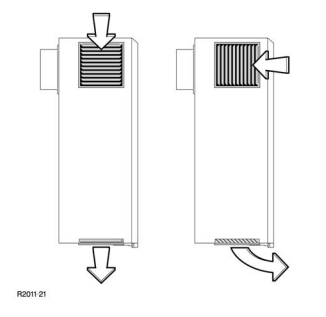 Sollte das Raumlüftungsgerät Air Mini an Orten installiert sein, an denen der Mindestabstand zu angeströmten Objekten nicht eingehalten werden kann, können Sie entsprechend das Abluft- und Zuluftgitter nach vorne drehen (siehe Abbildung). Entfernen Sie dazu die Frontverkleidung, lösen Sie die Gitter aus ihren Arretierungen und setzen Sie sie um 90° gedreht wieder ein.