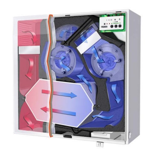 Parallel zusagt ein weiterer Lüfter frische Zuluft von außen an, führt sie durch den Wärmetauscher, reicht sie mit der entzogenen Wärmeenergie wieder an und befördert sie ins Rauminnere. Dabei passiert die Frischluft ebenfalls einen Staubfilter. Optional können Sie einen Pollenfilter sowie einen Aktivkohlefilter nachrüsten, was eine erhebliche Verbesserung des Raumklimas mit sich bringt. Potenziell entstehendes Kondensat wird im Geräteinneren gesammelt und kann mit weniger Handgriffen durch den Nutzer abgelassen werden.