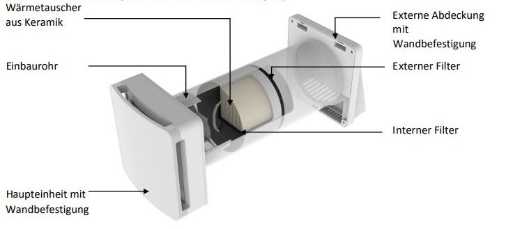 Südwind Ambientika Advanced+ Komplettset - Effiziente dezentrale WohnraumlüftungErleben Sie optimale Raumluftqualität mit dem Südwind Ambientika Advanced+ Komplettset – für ein gesünderes und komfortableres Zuhause.Das Südwind Ambientika Advanced+ Komplettset ist eine hochmoderne dezentrale Wohnraumlüftung mit integrierter Wärmerückgewinnung. Es sorgt für kontinuierlichen Frischluftaustausch, minimiert Energieverluste und schafft ein optimales Raumklima. Mit fortschrittlichen Sensoren und Smart Home Kompatibilität ist dieses System die ideale Lösung für effiziente und komfortable Belüftung in Wohn- und öffentlichen Räumen, selbst im Badezimmer.Ihre Vorteile im Überblick:Hocheffiziente Wärmerückgewinnung: Der Keramik-Wärmetauscher erreicht einen Wirkungsgrad von bis zu 93%, was Heizkosten spürbar senkt.Integrierte Smart Home Funktionen: Nahtlose Integration in Loxone und KNX Systeme für zentrale Steuerung und maximalen Komfort.Intelligente Sensorik: Mit Feuchtigkeits- und Dämmersensor für vollautomatischen Betrieb und eine auf Ihre Bedürfnisse abgestimmte Luftqualität.Einfache Installation und Wartung: Das dezentrale System benötigt keine komplexen Kanäle, ist schnell montiert und Filter sowie Wärmetauscher sind leicht zu reinigen.Flüsterleiser und Energiesparender Betrieb: Die geringe Geräuschentwicklung und der bürstenlose Motor garantieren einen diskreten und effizienten Einsatz.Flexible Systemerweiterung: Verbinden Sie bis zu 15 Geräte per Kabel für eine umfassende und koordinierte Belüftungslösung in größeren Gebäuden.Ideal für Nassräume: Speziell geeignet für den Einsatz im Badezimmer, da kein Kondenswasserablauf notwendig ist.Effiziente WärmerückgewinnungDas Herzstück des Ambientika Advanced+ ist der innovative Keramik-Wärmetauscher, der bis zu 93% der Wärme aus der Abluft zurückgewinnt.Dies führt zu einer erheblichen Reduzierung der Heizkosten, da die frische Zuluft bereits vorgewärmt in den Raum gelangt.Intelligente Sensorik für optimales KlimaDas Gerät verfügt über integrierte Feuchtigkeits- und Dämmersensoren, die den Betrieb automatisch an die Umgebungsbedingungen anpassen.Dies gewährleistet jederzeit ein gesundes Raumklima, verhindert Schimmelbildung und optimiert den Energieverbrauch, ohne dass Sie manuell eingreifen müssen.Nahtlose Smart Home IntegrationDank des RS485-Busanschlusses ist das Ambientika Advanced+ kabelgebunden und kann problemlos in Smart Home Systeme wie Loxone und KNX integriert werden.Sie erhalten maximale Flexibilität bei der Steuerung und können Ihr Lüftungssystem zentral über Ihre bestehenden Smart Home Schnittstellen bedienen.Vielseitige Betriebsmodi und SteuerungWählen Sie zwischen unterschiedlichen Einstellungen und Programmen, um den Luftaustausch präzise an Ihre Bedürfnisse anzupassen.Eine mitgelieferte Fernbedienung bietet zusätzlichen Komfort bei der Bedienung.Technische SpezifikationenParameterWertHinweisArtikelnameSüdwind Ambientika Advanced+KomplettsetEinbauortWandEinbauartAufputz / UnterputzEinbaulageFast horizontalMit 1-2° Gefälle nach außenMaterialKunststoff (PP für Rohr)Hochqualitative Materialien, Polypropylen (PP) lebensmittelecht für PVC RohrKlappeAutomatischNennweite100 mmRohrdurchmesserStromversorgung230 V / 50 HzSchutzklasseIP44Schallschutz gegen Außenlärm43 (-2;-4) dBBewertete Normschallpegeldifferenz Dn,e,w (C;Ctr)MotorElektronisch gesteuertBürstenlos (Brushless)ParameterWertBesonderheitFördervolumen10, 20, 30 m³/h (regelbar)Max. 60 m³/hWirkungsgrad Wärmerückgewinnungbis zu 93 %Keramischer WärmetauscherNennleistung3,2 - 6,7 W(Angaben variieren zw. Ø 6,7W und 3,2-5,9W/3,9-6,7W)Schallpegel (3m Abstand)20 - 30 dB(A)(20 dB(A) min, 24-30 dB(A) max)Fördermitteltemperatur (IMax)40 °CBetriebstemperatur-20 °C bis +50 °CAbmessung / BereichWertHinweisWandstärke (min.)250 mmMaximale Wandstärke 400-500 mmWandhülse Länge500 mmKürzbarMax. Rohrlänge (Verlängerung)2,5 MeterInkl. einem 90°-KnickEmpf. Montagehöhe2,3 mUnterkanteBreite (Außenwandbefestigung inkl. Wetterhaube)212 mmBreite (Innenwandbefestigung inkl. Design Abdeckhaube)233 mmHöhe (Außenwandbefestigung inkl. Wetterhaube)212 mmHöhe (Innenwandbefestigung inkl. Wetterhaube)250 mmTiefe (Außenwandbefestigung inkl. Wetterhaube)54 mmTiefe (Innenwandbefestigung inkl. Wetterhaube)42 mmParameterWertHinweisAnzahl Filter2Getrennt für Luftein- und -austrittFilterklasseG3Nach EN 779Einsatzbereiche & AnwendungsszenarienDas Südwind Ambientika Advanced+ Komplettset ist vielseitig einsetzbar und eignet sich hervorragend für die Belüftung von Wohnräumen sowie öffentlich genutzten Räumen.Besonders im Badezimmer, wo Feuchtigkeitsregulierung entscheidend ist und kein Kondenswasserablauf benötigt wird, spielt es seine Stärken aus.Es ist die ideale Lösung für Einzelraumlösungen und kann auch als einfacher Ersatz für bestehende Entlüftungssysteme genutzt werden.Hersteller & QualitätDie Südwind GmbH steht für hochwertige dezentrale Lüftungssysteme.Das Ambientika Advanced+ Komplettset wird aus stabilen, hochqualitativen Materialien gefertigt und überzeugt durch sein ansprechendes Design. Dies garantiert Langlebigkeit und zuverlässige Funktion für Ihr Zuhause oder Büro.Investieren Sie jetzt in frische, gesunde Luft und sparen Sie gleichzeitig Heizkosten!Das Südwind Ambientika Advanced+ Komplettset bietet Ihnen Komfort, Effizienz und ein optimales Raumklima. Kontaktieren Sie uns für eine individuelle Beratung und finden Sie die perfekte Lüftungslösung für Ihre Bedürfnisse.
