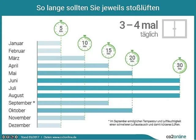 In einem mäßig-gedämmten Altbau reicht es aus, mehrmals am Tag für vier bis zehn Minuten zu lüften. In einem stark gedämmten Haus hingegen, sollten Sie alle 2 Stunden für einen ausreichenden Luftaustausch sorgen. Die Lüftungsdauer variiert jedoch je nach Jahreszeit und Witterung. Durch die starken energieeffizienten Vorgaben heutzutage, ist eine natürliche Infiltration meist gar nicht mehr möglich wodurch deutlich häufiger gelüftet werden muss. In aktuellen Gerichtsverfahren zu Schimmelstreitfragen wurde ein zu häufiges Lüften am Tag als „unzumutbar“ für Bewohner deklariert (Bild: CO2Online)