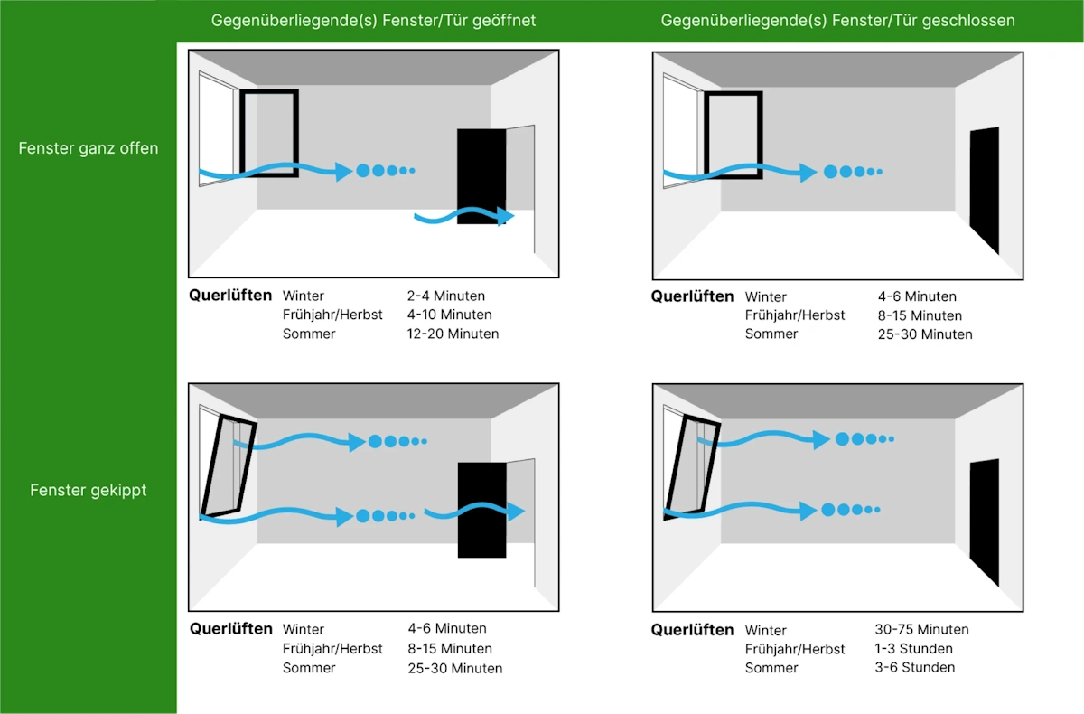 Fensterlüftung kann lediglich als ergänzende Maßnahme zum Einsatz kommen, wenn es durch nutzerabhängiges Verhalten (z. B. Duschen oder Kochen) temporär zu höheren Feuchtelasten kommt.