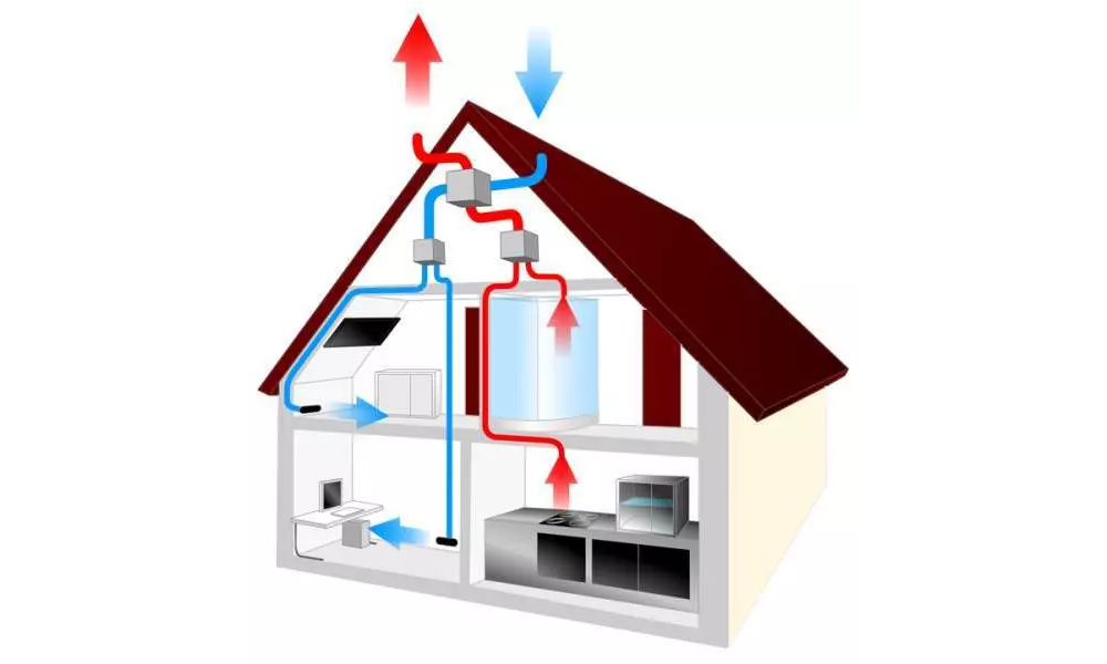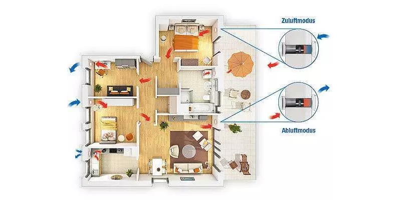 Die zentrale Lüftungsanlage mit Luftverteilsystem ist ein effizienter Weg, sein Haus mit Frischluft zu versorgen und Schadstoffe abzutransportieren. Darin integriert ist ein Wärmetauscher und zwei Ventilatoren, die jeweils in getrennten Kanälen die verbrauchte Luft aus den Räumen saugen und Frischluft wieder hinzugeben. Dabei werden die Räume des Hauses in Zuluft- und Ablufträume unterteilt, wobei feuchtigkeitsärmere Räume (wie das Wohnzimmer oder Schlafzimmer) in Zuluft- und feuchtigkeitsreiche Räume (wie Küche und Bad) in Ablufträume unterteilt werden.