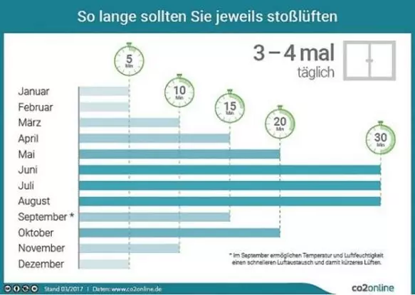 Je nach Monat bzw. Jahreszeit ist die empfohlene Dauer zum Stoßlüften verschieden