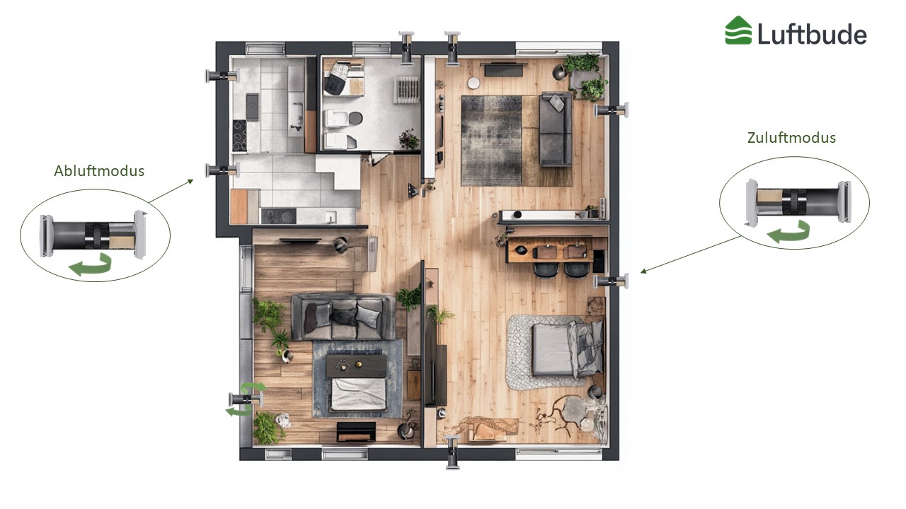 Auch hier kann der Nutzer im Lüftungskonzept teilweise mit aktiver Fensterlüftung einbezogen werden.