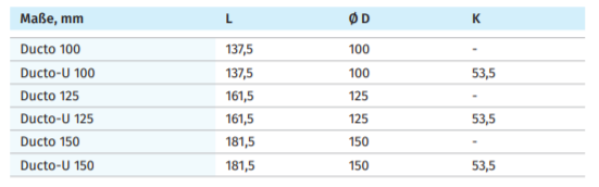 Modell | Ducto 100 T | Ducto 125 | Ducto 150 | Ducto 100 Plus | Ducto 125 Plus | Ducto 150 Plus | |||