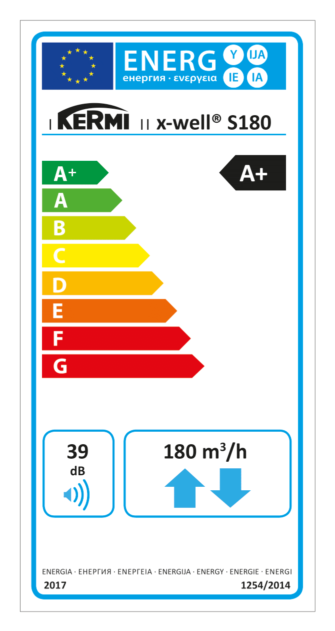 | x-well Wohnraumlüftungsgerät S180 / S180 E | bis ca. 125 m2 | 92,1 % / 88,6 % | 39 dB(A) | A+ / A |