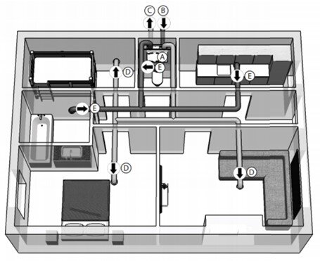 - (D) Zuluftventile in den Wohn- und Schlafzimmern