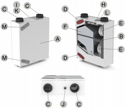 - H) Elektronikbox mit Steuerplatine mit Anschlüssen für die Ventilatoren, den Bypass, das Frostschutzelement, Temperatursensoren, der Funkfernbedienung RF (optional) und einem Badezimmerschalter (optional)