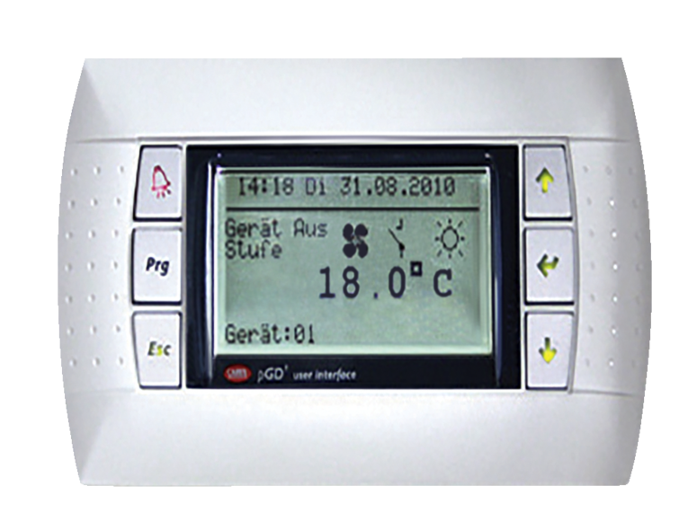 Diese Steuerung ermöglicht die gleichzeitige Regelung von bis zu 20 dezentralen Lüftungsgeräten über eine zentrale Bedieneinheit.