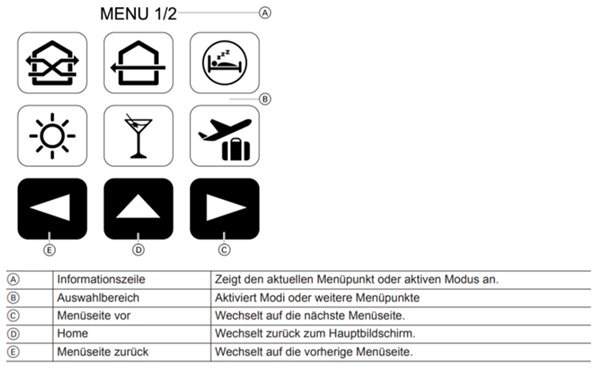 | Urlaubs-Modus | Optimale Belüftung leerer Räume bei reduzierter Lüftungsstufe und niedrigstem Stromverbrauch. |